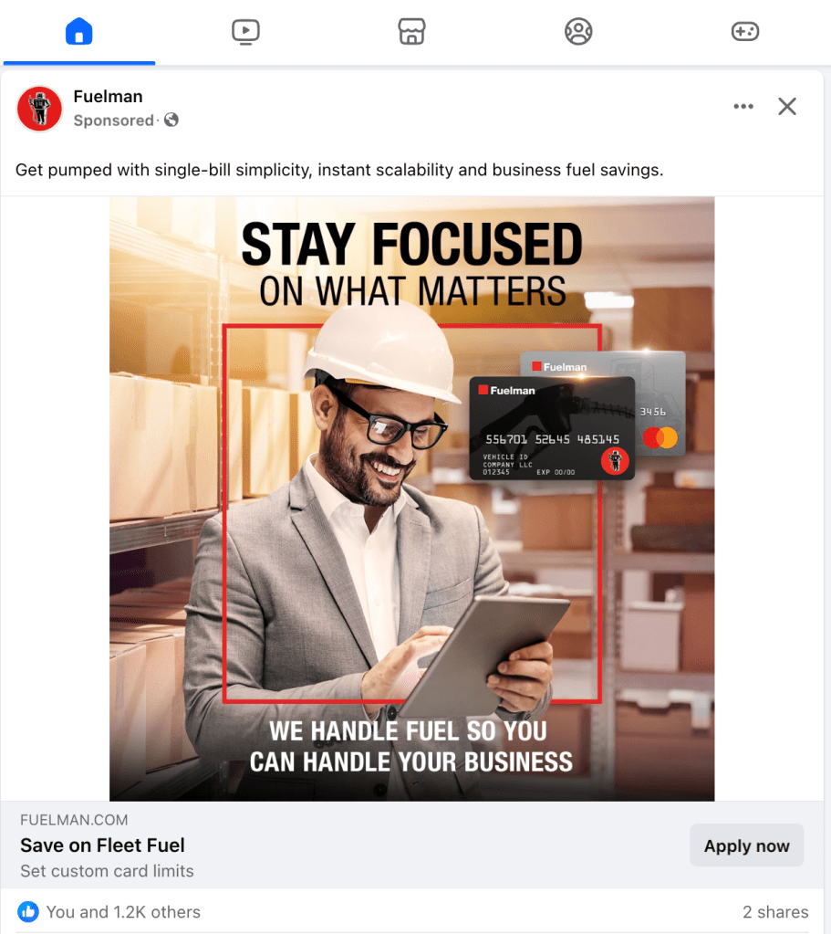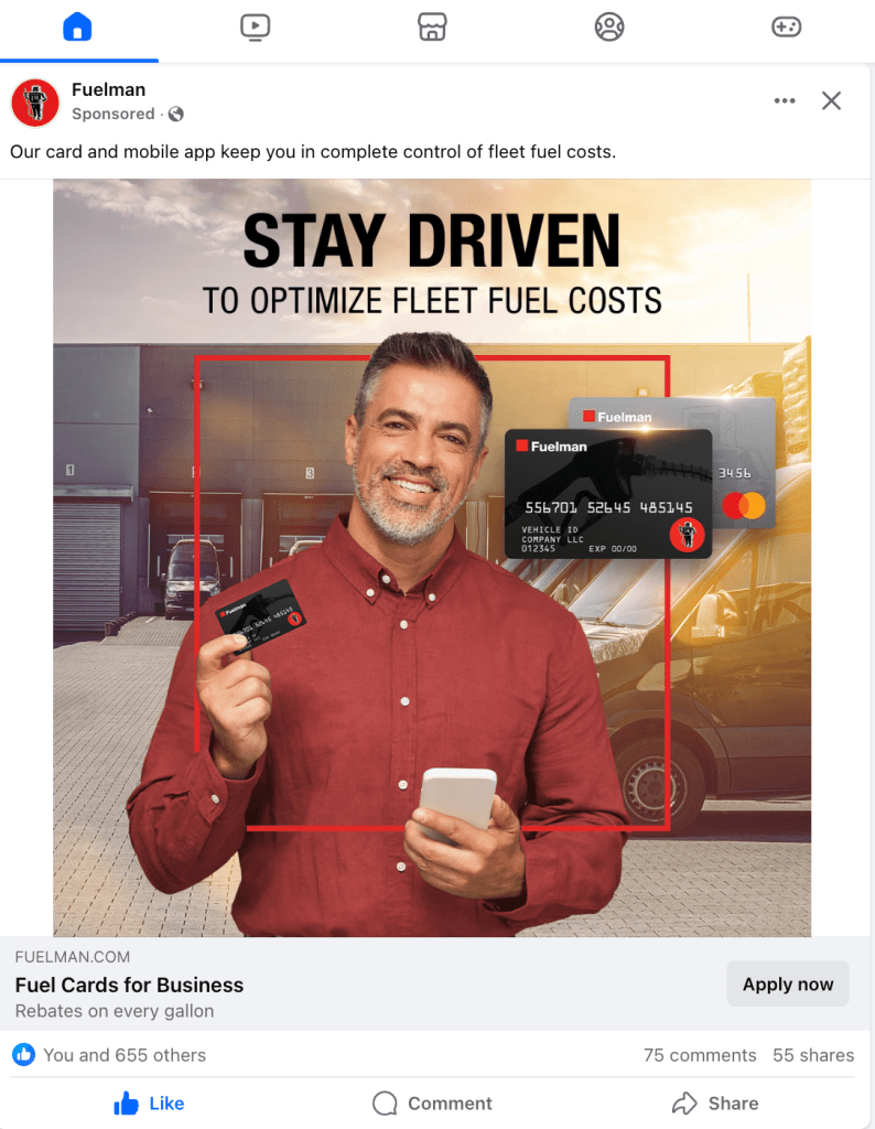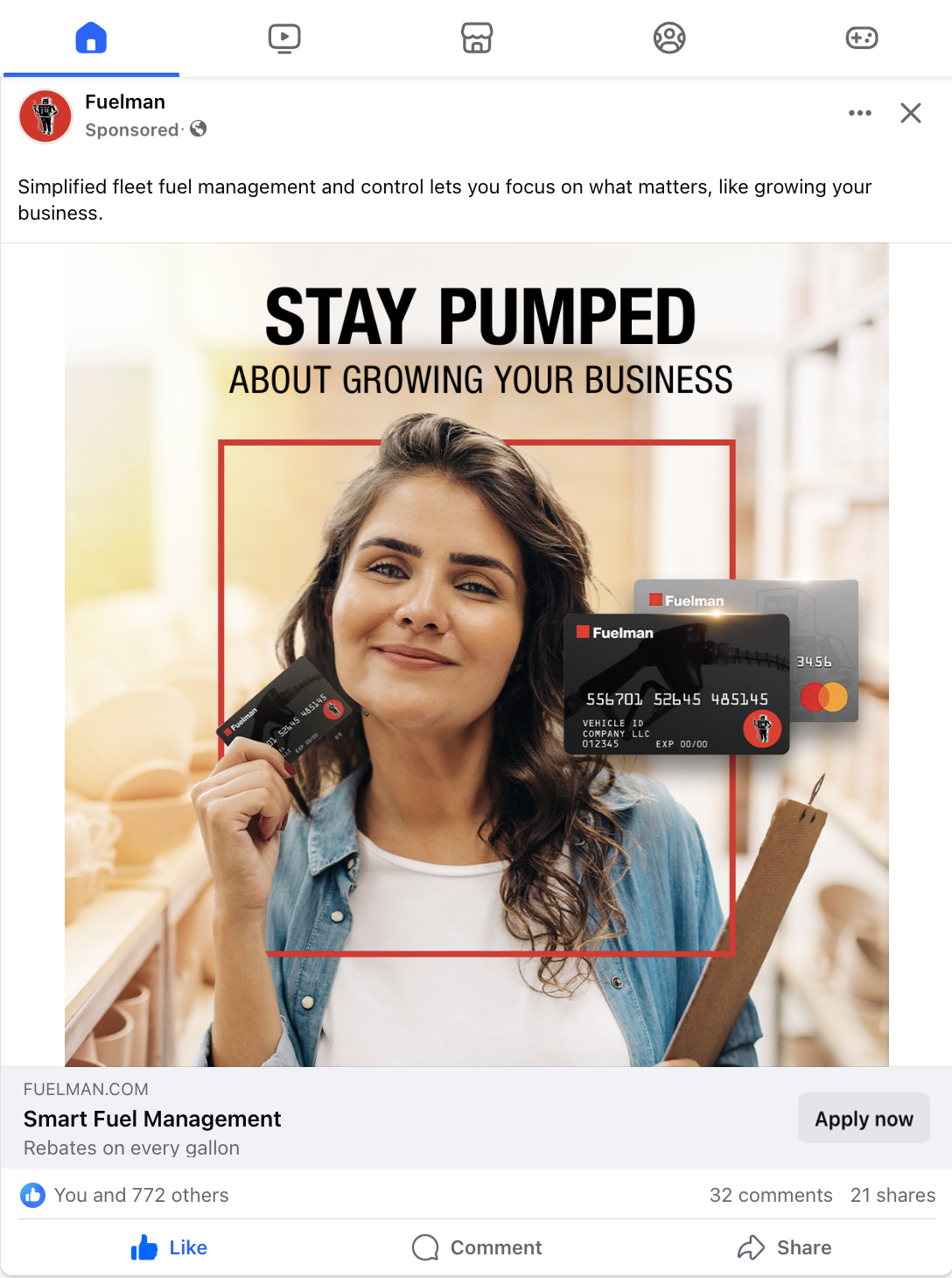 Paid social campaign for Fuelman Fuel Cards targeting small to medium businesses with 2 to 25 vehicles in their fleet. I developed the Stay Pumped campaign concept, wrote all content and post copy. The client reported that this campaign saw click through rates 141% higher than their previous campaign.